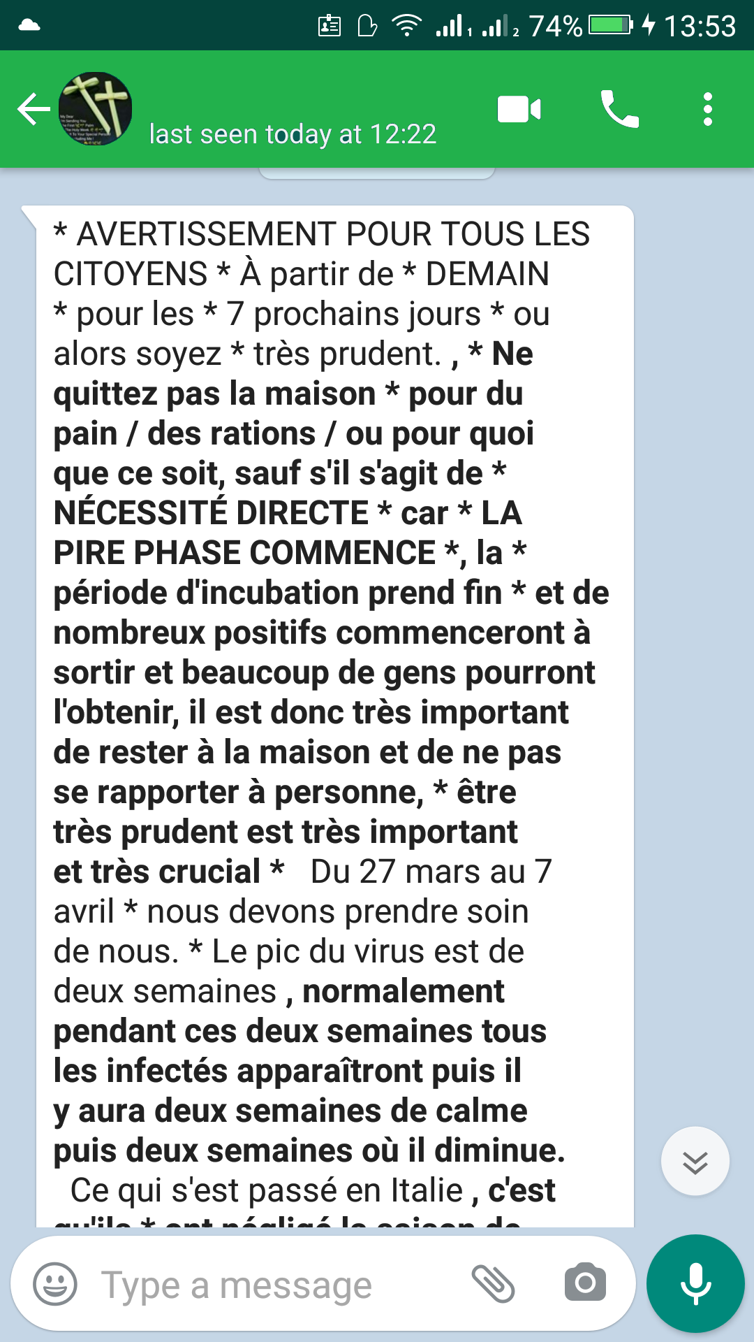 Il y a une semaine, j’ai reçu d’un contact WhatsApp, une information sans auteur, avertissant «tous les citoyens» qu’ils ne devaient sortir de chez eux sous aucun prétexte en raison du commencement «de la pire phase» de la pandémie.